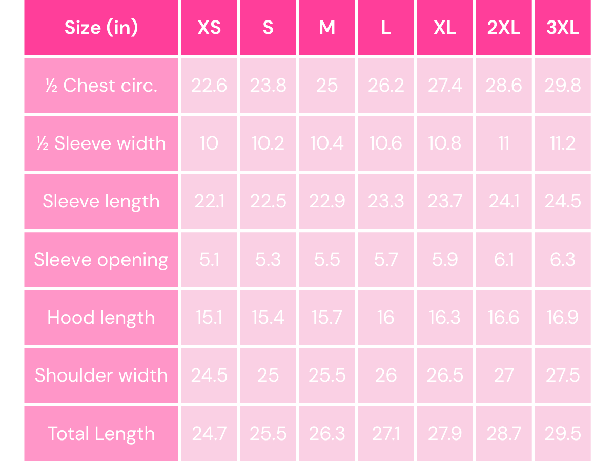 Made from secondhand materials such as quilts and blankets, each hoodie is wonderfully unique. Refer to this chart to find the best fit for you.